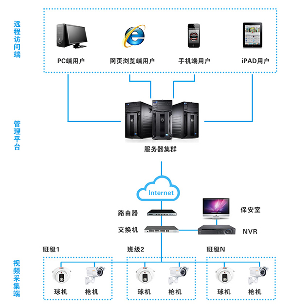 采用高清IPC+高清NVR組網(wǎng)方式,在工廠企業(yè)內(nèi)部(如車間、走廊、活動(dòng)室、辦公室等場(chǎng)所)等重要點(diǎn)位部署720P1080P高清網(wǎng)絡(luò)攝像機(jī),后端采用NVR進(jìn)行高清存儲(chǔ),實(shí)現(xiàn)重要部位的高清監(jiān)控與錄像。